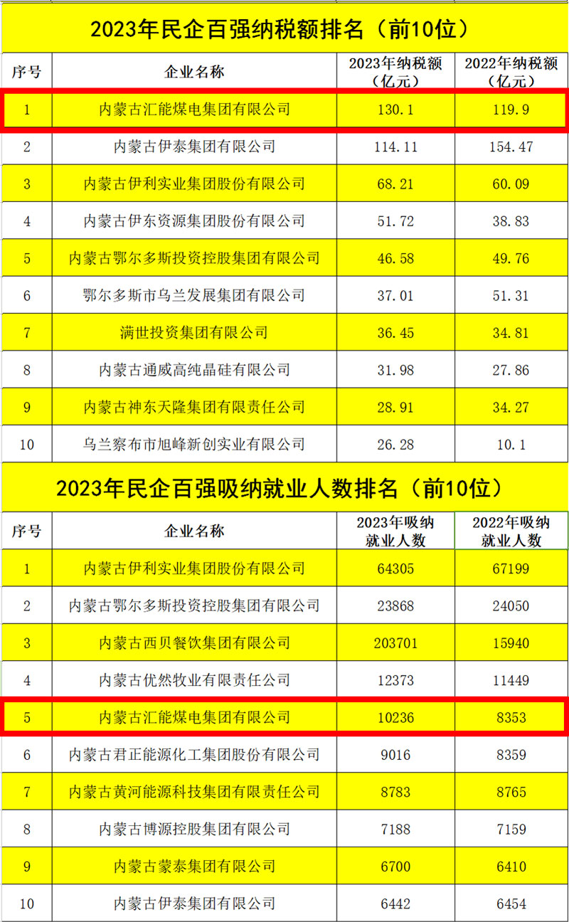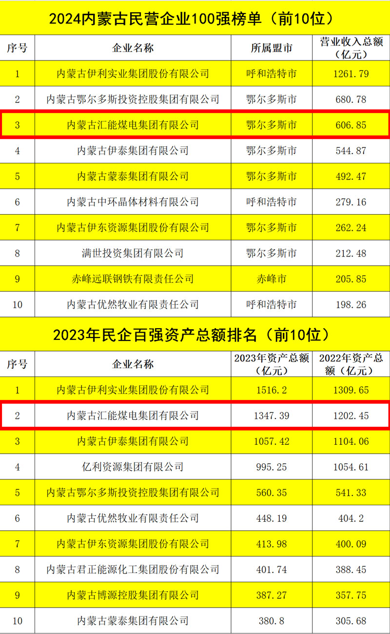 6月25日,2024內(nèi)蒙古民營企業(yè)100強發(fā)布會暨內(nèi)蒙古自治區(qū)促進“兩個健康”現(xiàn)場會在內(nèi)蒙古鄂爾多斯市舉行。會上公布了2024內(nèi)蒙古民營企業(yè)100強系列榜單,匯能集團以606.85億元營收總額榮列百強榜單第三位,較上年增長110.41億元,上升一位;資產(chǎn)總額1347.39億元,較去年增長144.94億元,仍位列民企百強第二位;納稅額130.1億元,位列民企百強第一位,較上年增長10.2億元,上升一位;吸納就業(yè)人數(shù)10236人,位列民企百強第五位,較上年增加1883人,上升兩位。